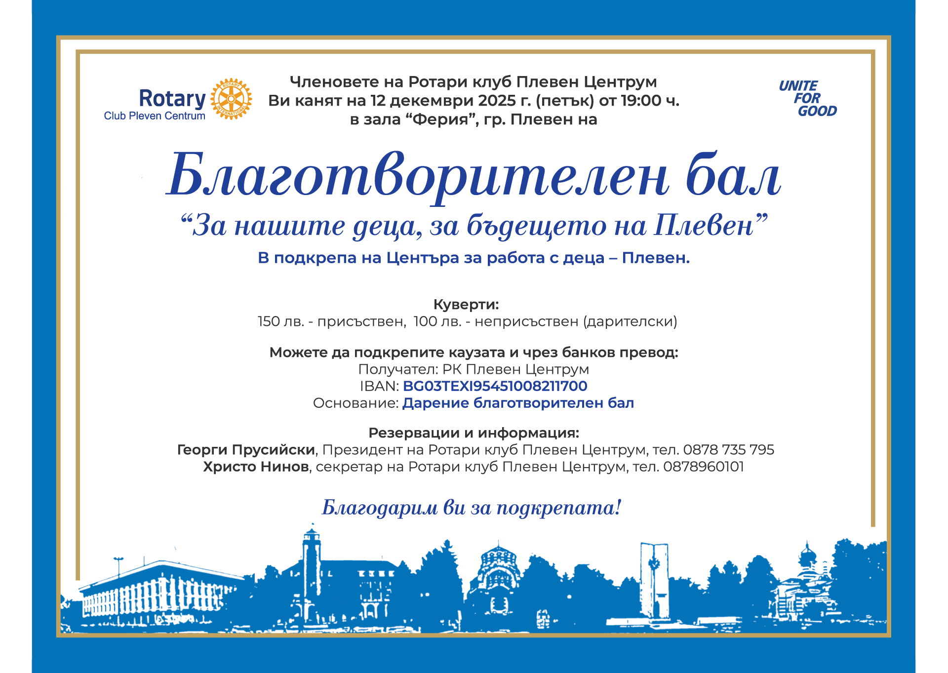 Каним ви на нашия Коледен благотворителен бал на Ротари клуб Плевен Центрум – „За нашите деца, за бъдещето на Плевен“. Ще се видим на 12 декември 2025 г. (петък) от 19:00 ч. в зала „Феерия“, гр. Плевен. Нека отново съберем дружината и направим добро – както само ротарианци и приятели умеем.