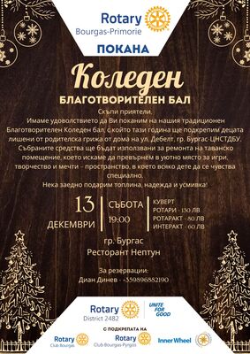 Начална дата: 13/12/2025 Крайна дата:Бургаските Ротари клубове, ИАК и РАК Бургас Приморие, и Инер Уил организират баготворителен бал на 13 декември в ресторант Нептун от 19.00