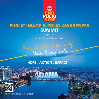 С голямо удоволствие Ви каним на Регионалната среща на Ротари – Зона 21, посветена на полиомиелита и публичния имидж, международен форум, насочен към утвърждаване на водещата роля на Ротари в последната решителна фаза от нашата голяма цел - свят без полиомиелит. Това важно събитие ще се проведе в периода 12–15 март 2026 г. в Адана, Турция и се организира съвместно от Координационния екип на EndPolioNow на Зона 21 и Екипа по публичен имидж на Зона 21.